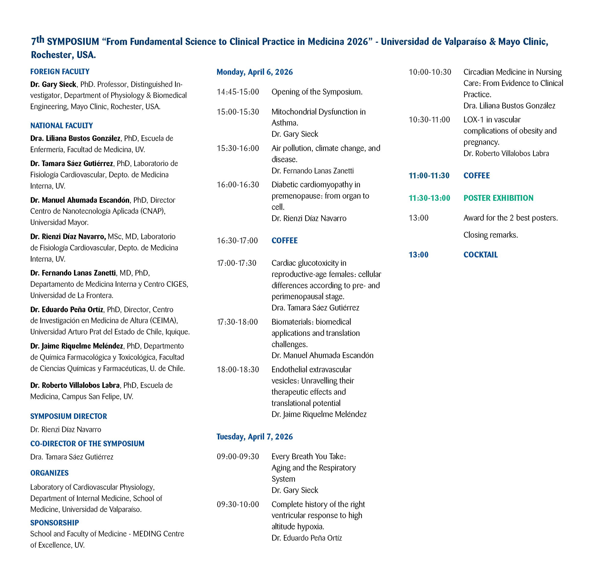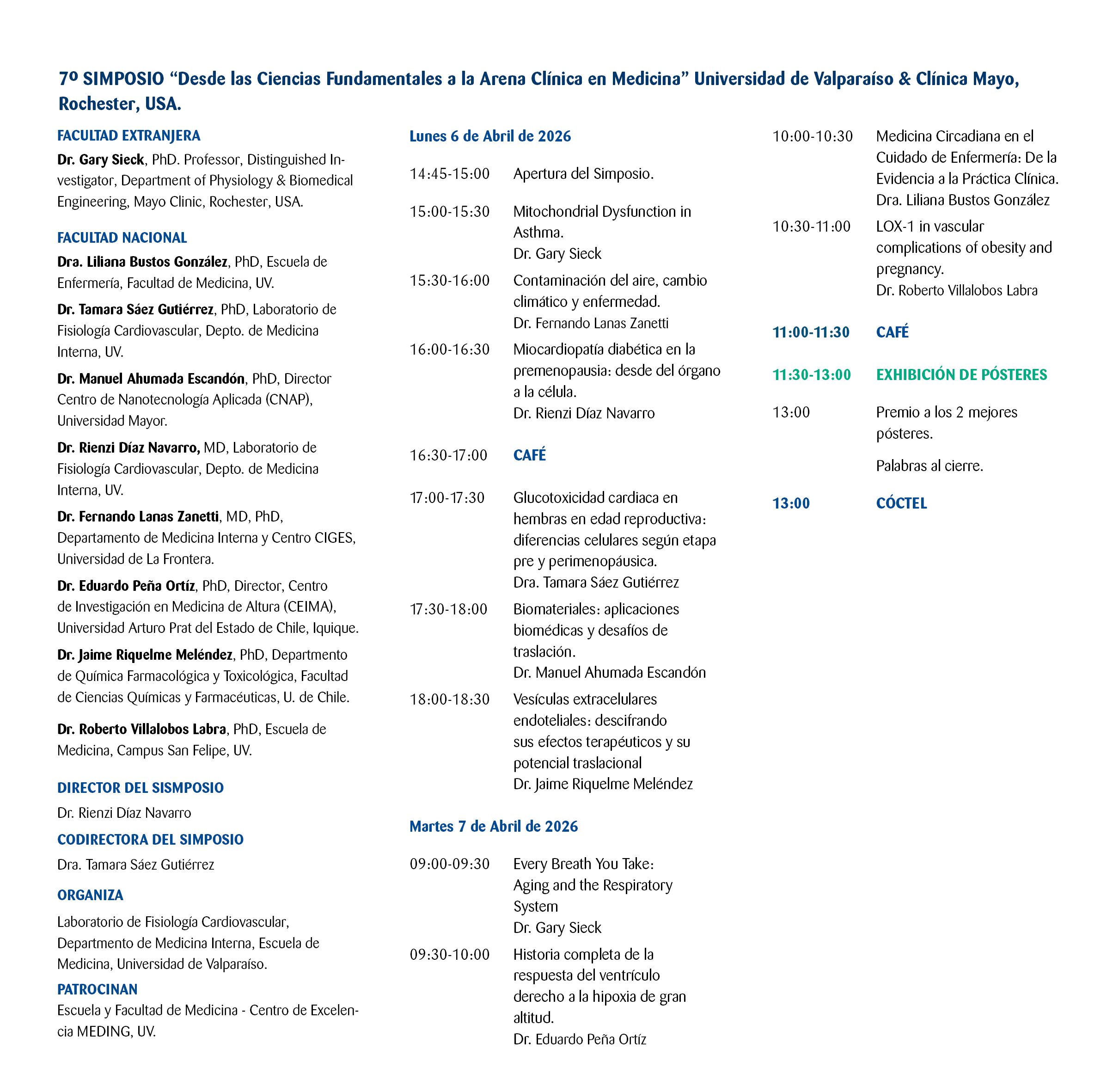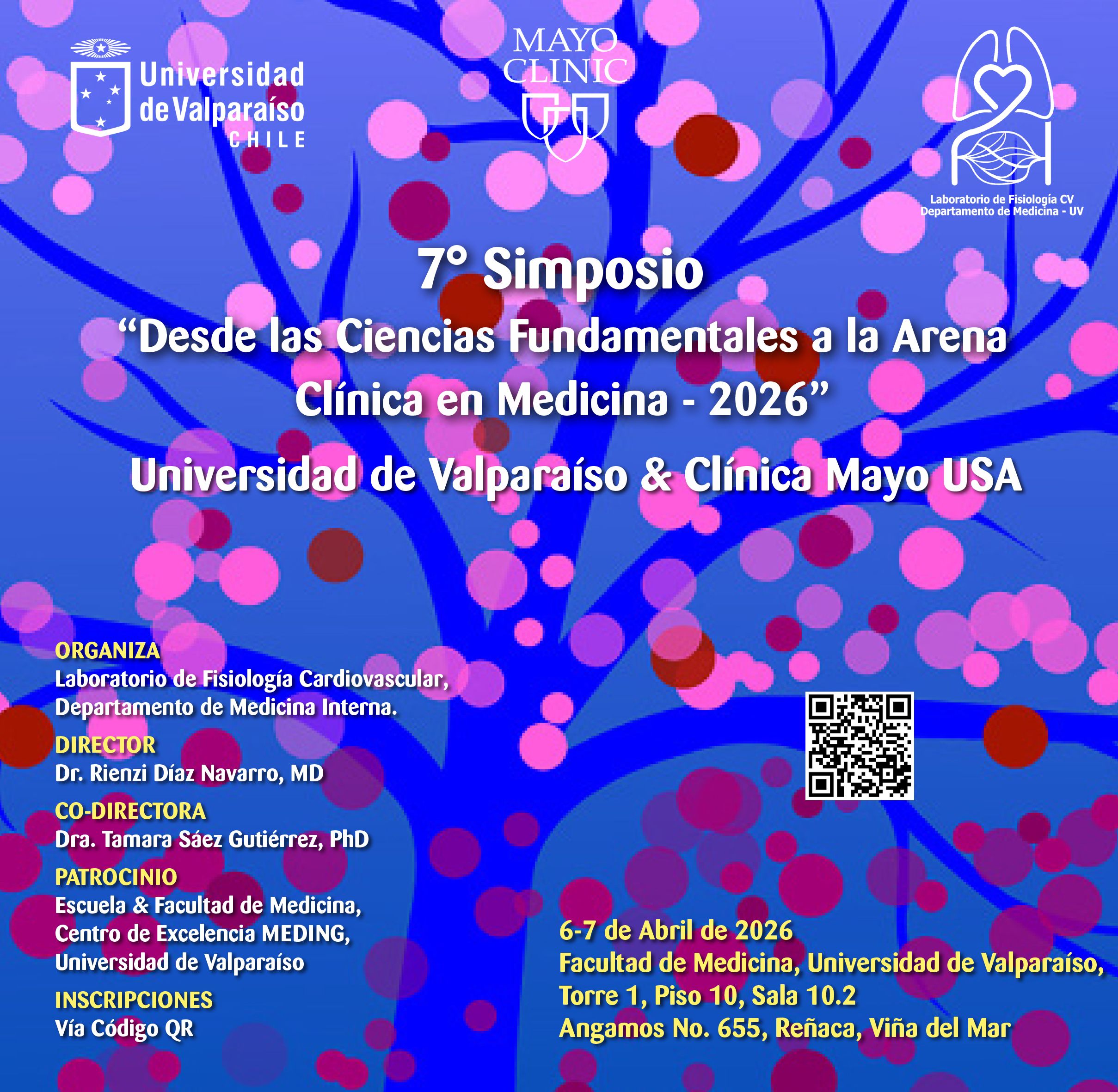 Los días 6 y 7 de abril de 2026, se realizará el 7° Simposio Internacional "Desde las Ciencias Fundamentales a la Arena Clínica en Medicina 2026", organizado por el Laboratorio de Fisiología Cardiovascular del Departamento de Medicina Interna de la Escuela de Medicina - Universidad de Valparaíso.